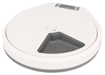 The TX4+1 Automatic Feeder is a convenient solution for automatically feeding your pet. This white/grey feeder has a capacity of 5 x 0.25 liters, allowing for up to 4 feeding intervals per day. The feeder is designed to deliver 4+1 meals of 0.25 liters, making it suitable for both small amounts of dry and wet food. The included feeding bowls are easily removable and dishwasher safe for convenient cleaning. The product is battery operated and requires 4 AA batteries (not included). This feeder offers a reliable way to automate the feeding routine and ensure your pet gets appropriate meals throughout the day.
